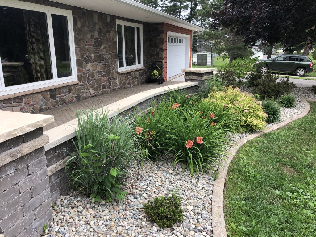A low seat wall was incorporated not only to support the access ramp but also to serve as a functional and aesthetic feature, creating a cozy boundary for low-maintenance plantings. This combination of hardscape and landscaping enhances both usability and charm, offering an entrance that is welcoming for visitors, practical for everyday living, and thoughtfully integrated into the home’s overall design.