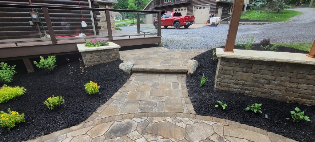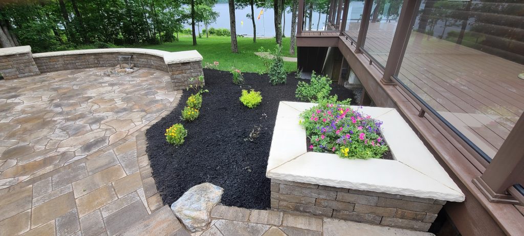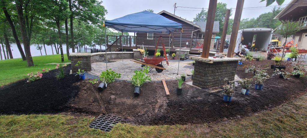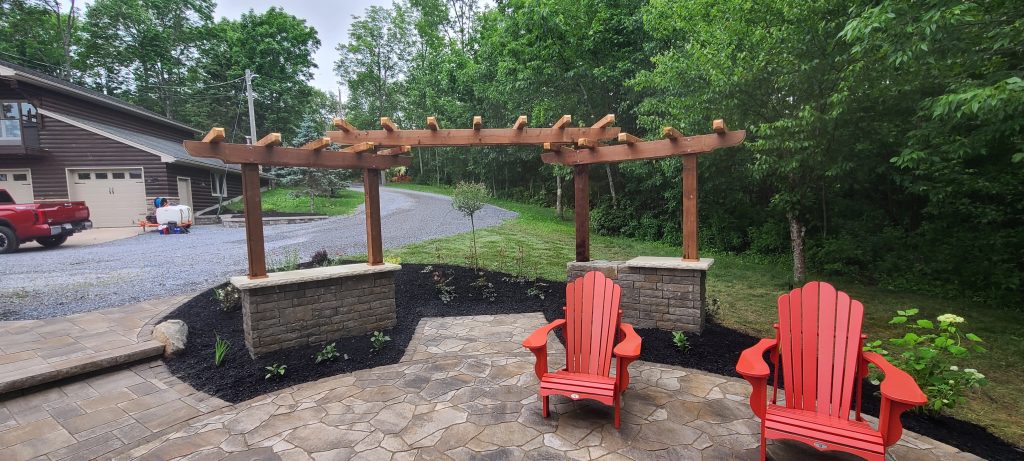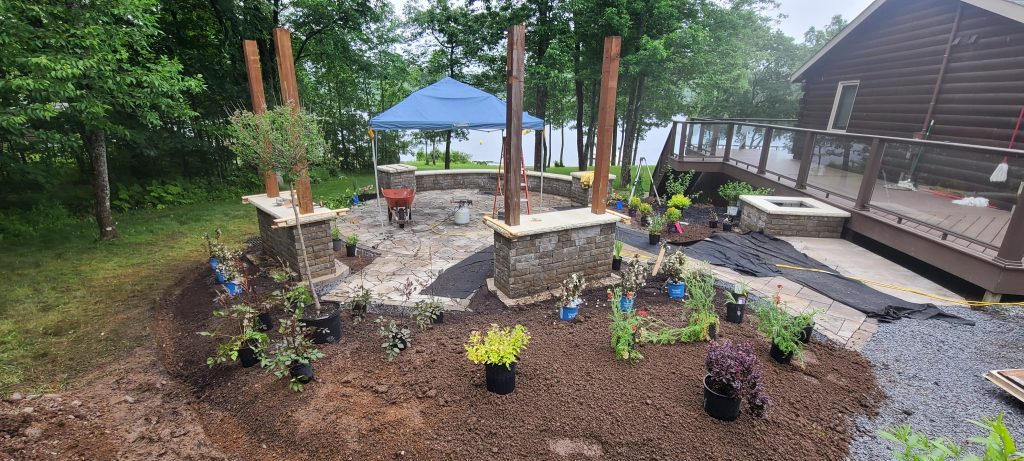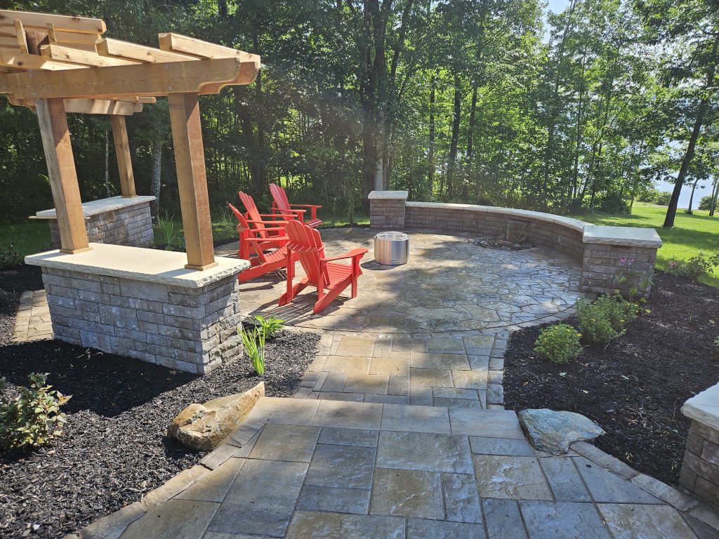 We brought that vision to life with a beautifully expanded patio framed by colourful garden beds and a trellis that blooms throughout the summer. The gentle sound of water adds a soothing backdrop, while the fireplace creates a warm focal point for evening gatherings. Earth-tone pavers in a natural flagstone pattern blend seamlessly with the property, grounding the space in its surroundings and creating a timeless, inviting retreat by the water.