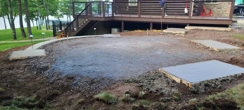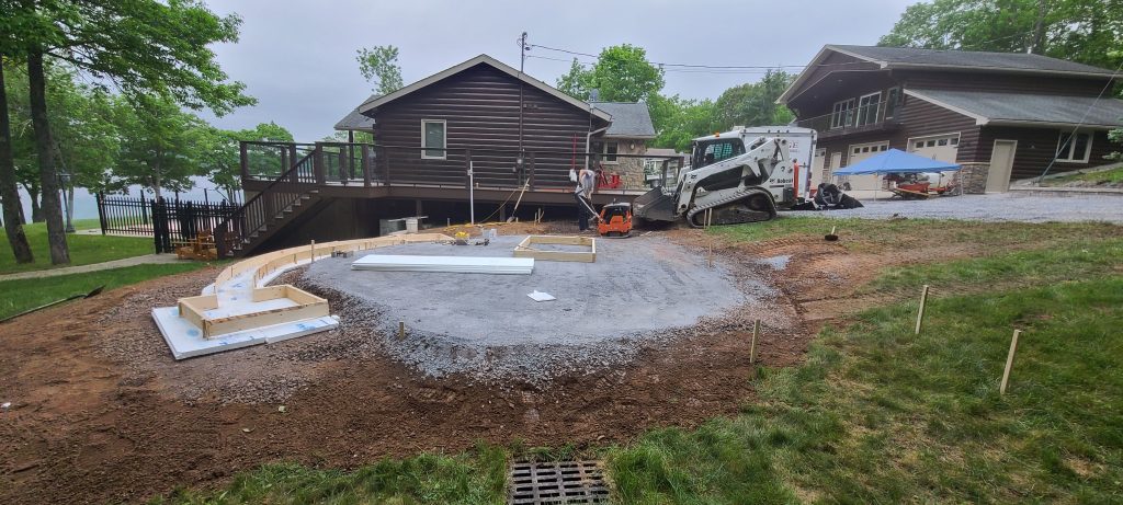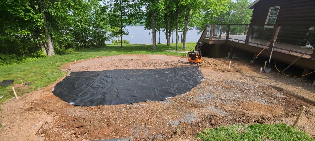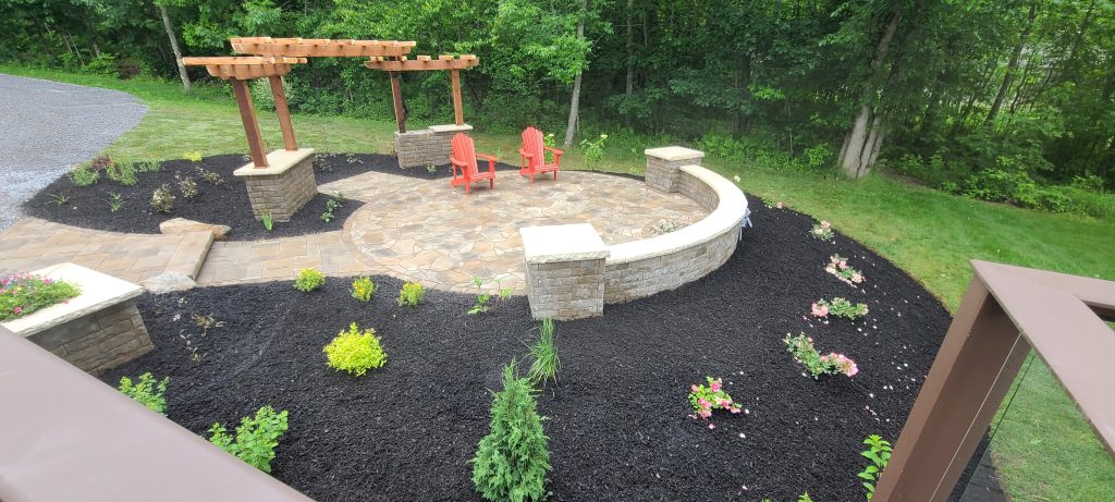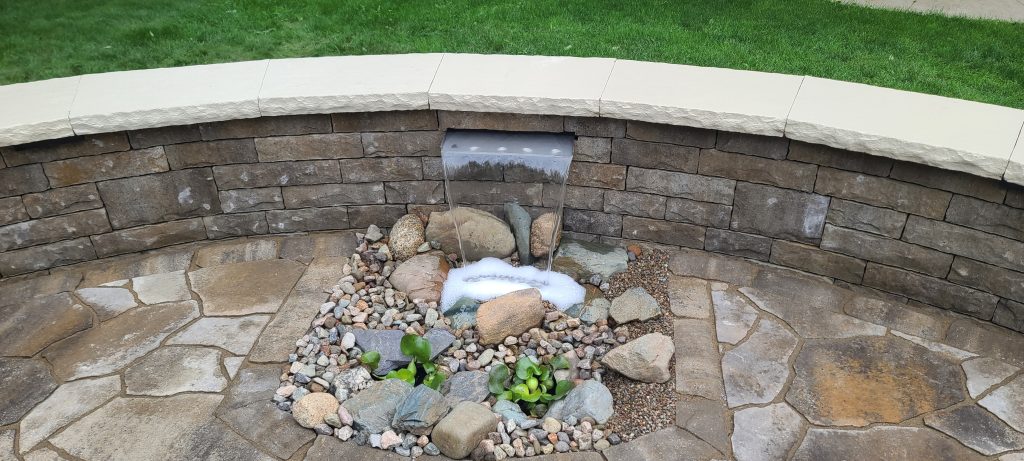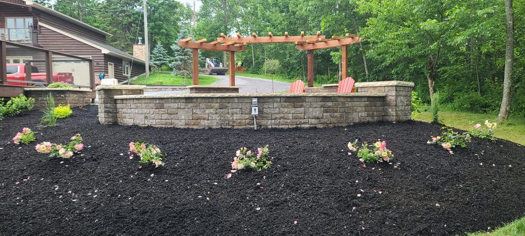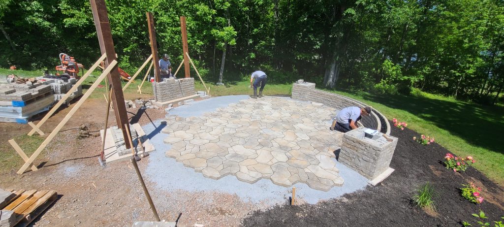 We brought that vision to life with a beautifully expanded patio framed by colourful garden beds and a trellis that blooms throughout the summer. The gentle sound of water adds a soothing backdrop, while the fireplace creates a warm focal point for evening gatherings. Earth-tone pavers in a natural flagstone pattern blend seamlessly with the property, grounding the space in its surroundings and creating a timeless, inviting retreat by the water.
