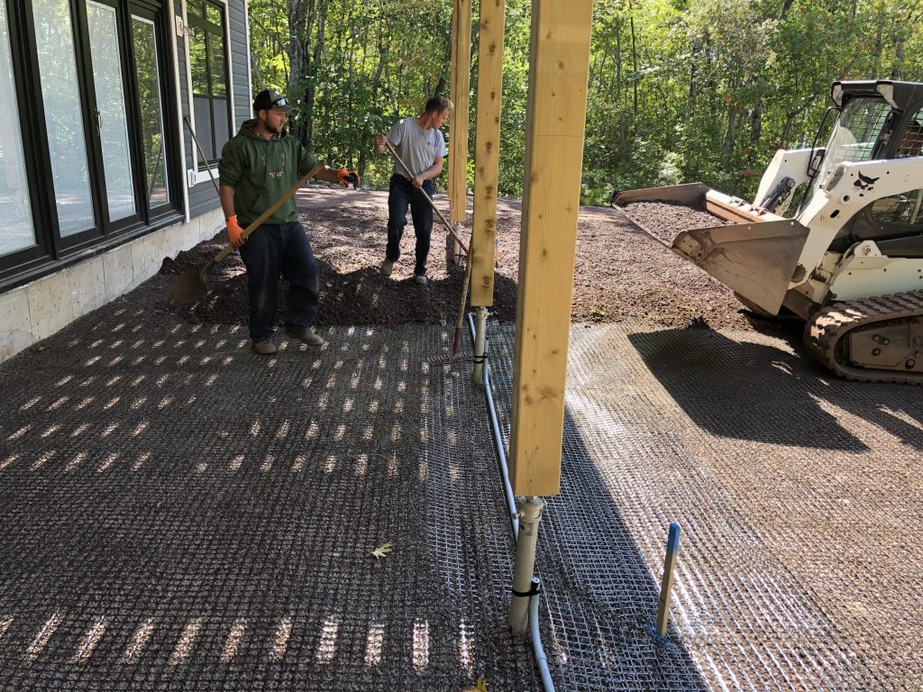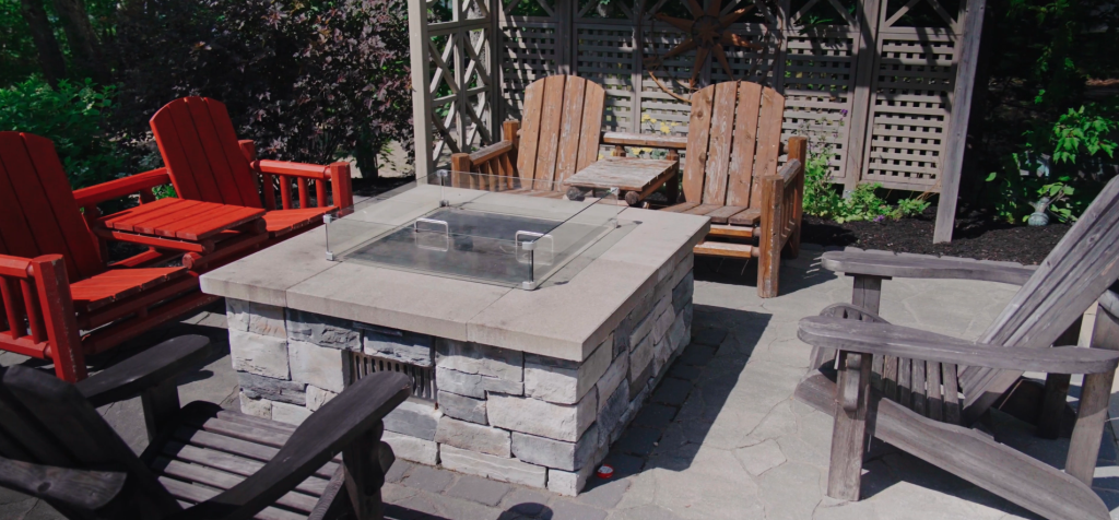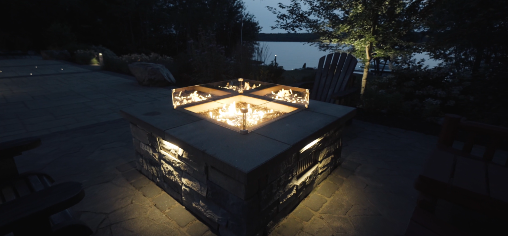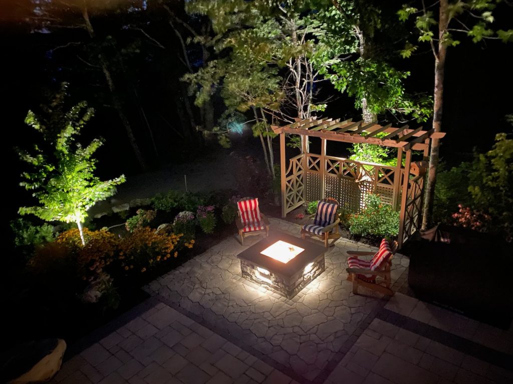 Soft glows along the exterior and patio areas create a warm and welcoming ambiance, perfectly complementing the flicker of the fireplace. The lighting not only enhances the visual appeal of the home at night but also improves safety and usability, allowing the homeowners to enjoy their outdoor spaces well into the evening.