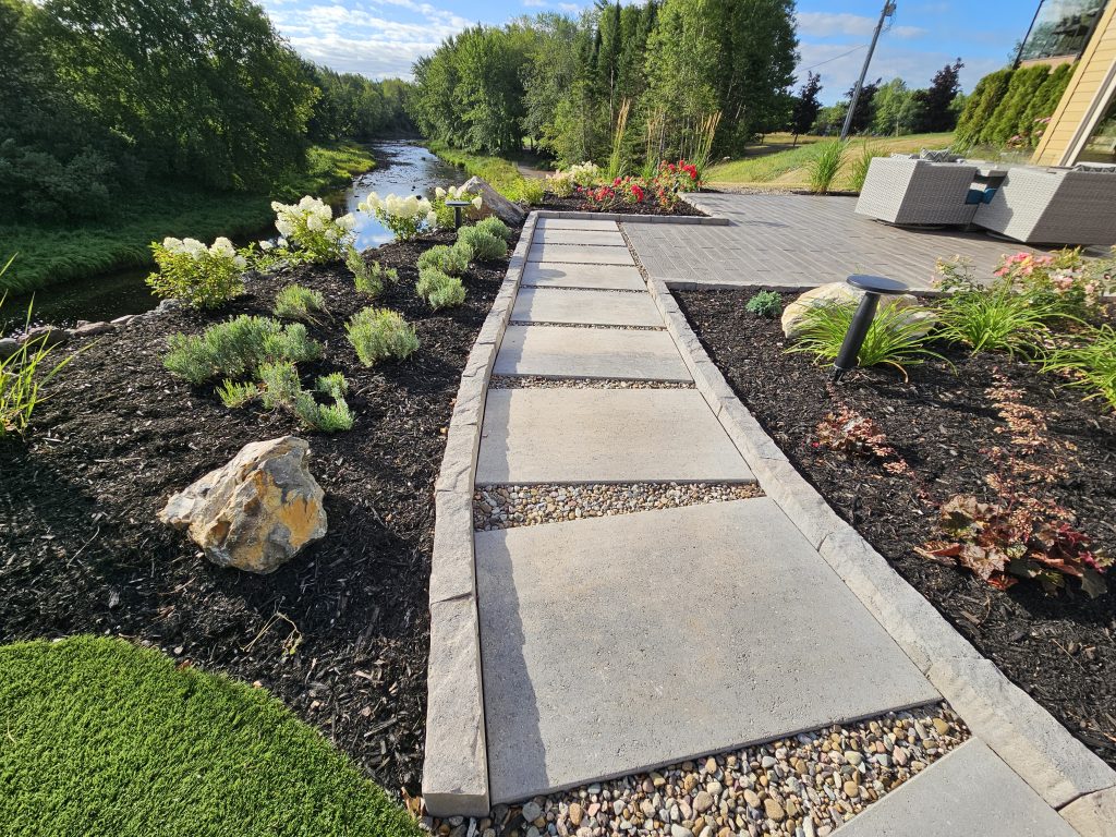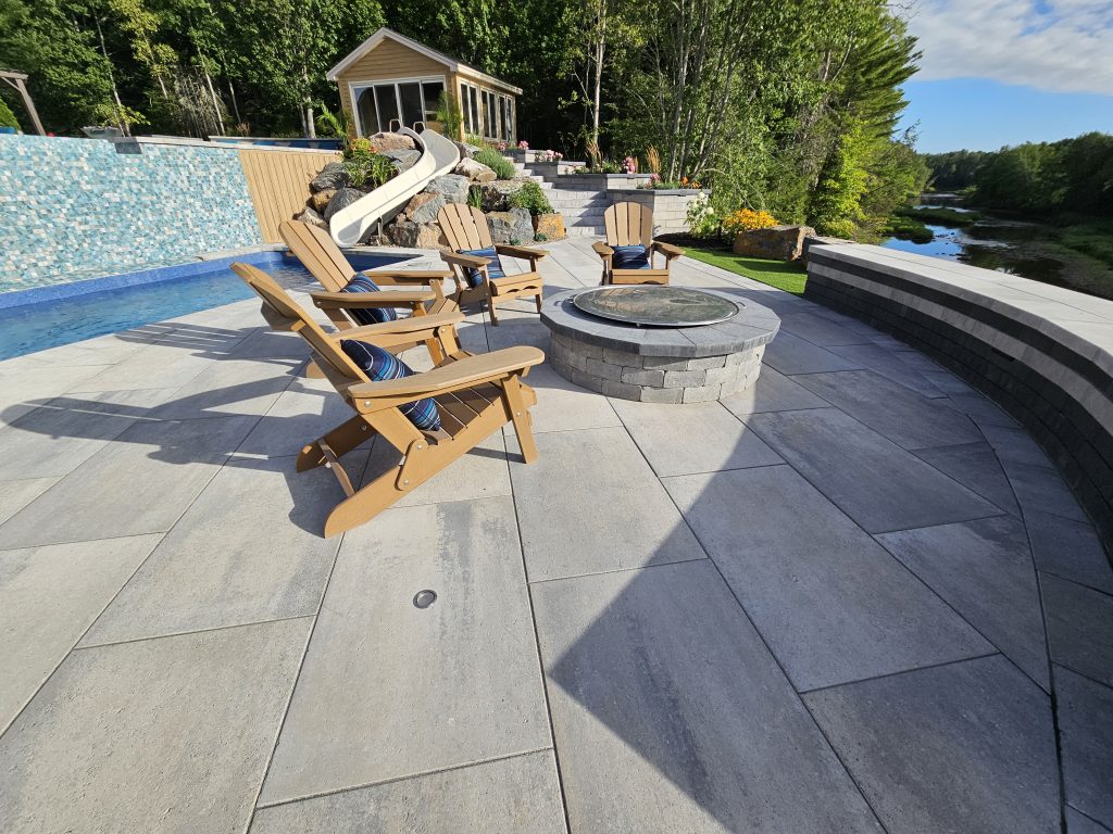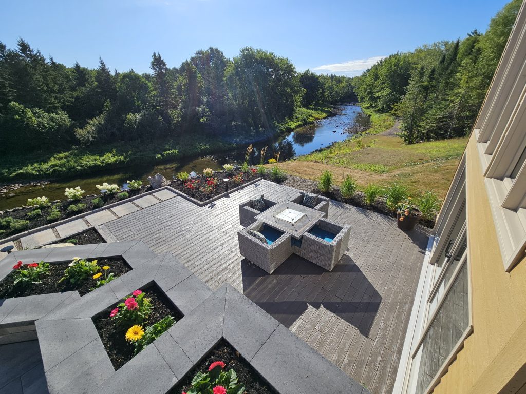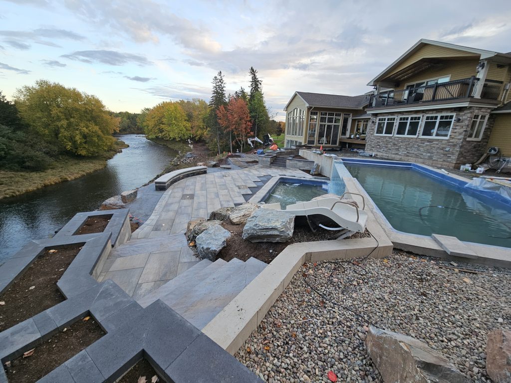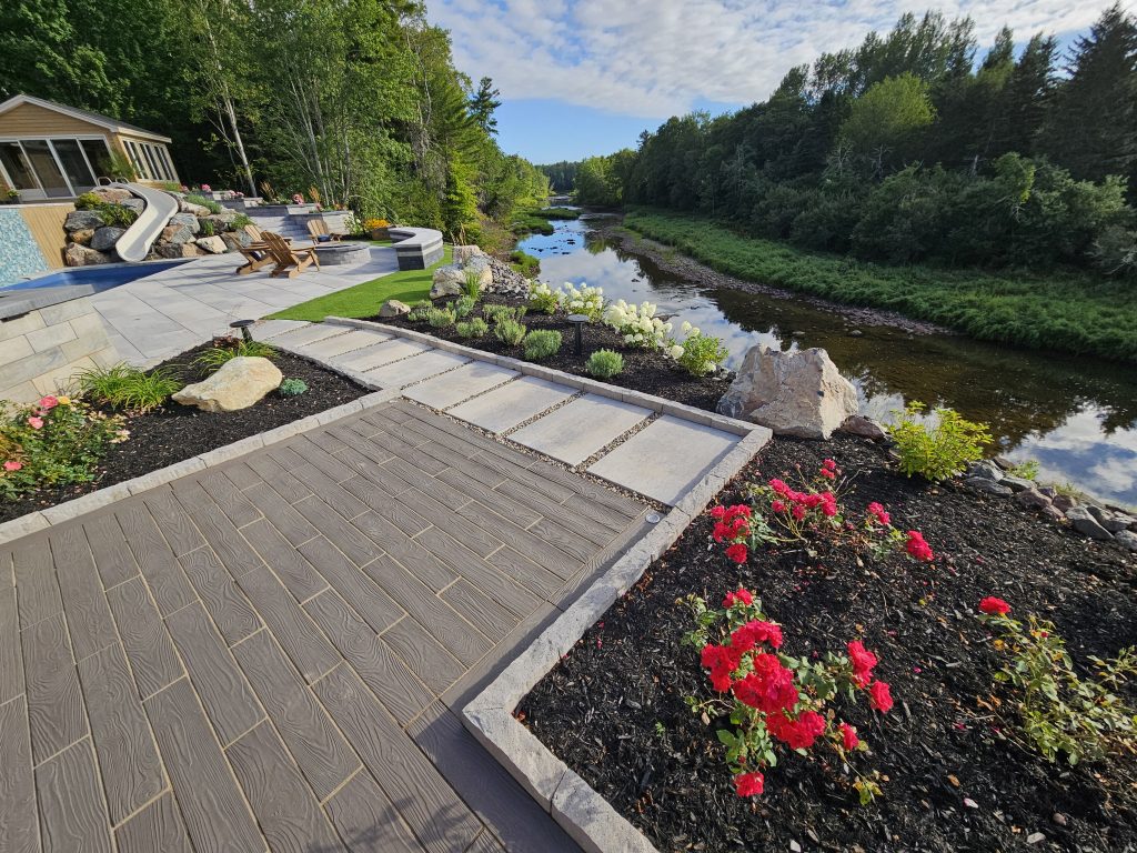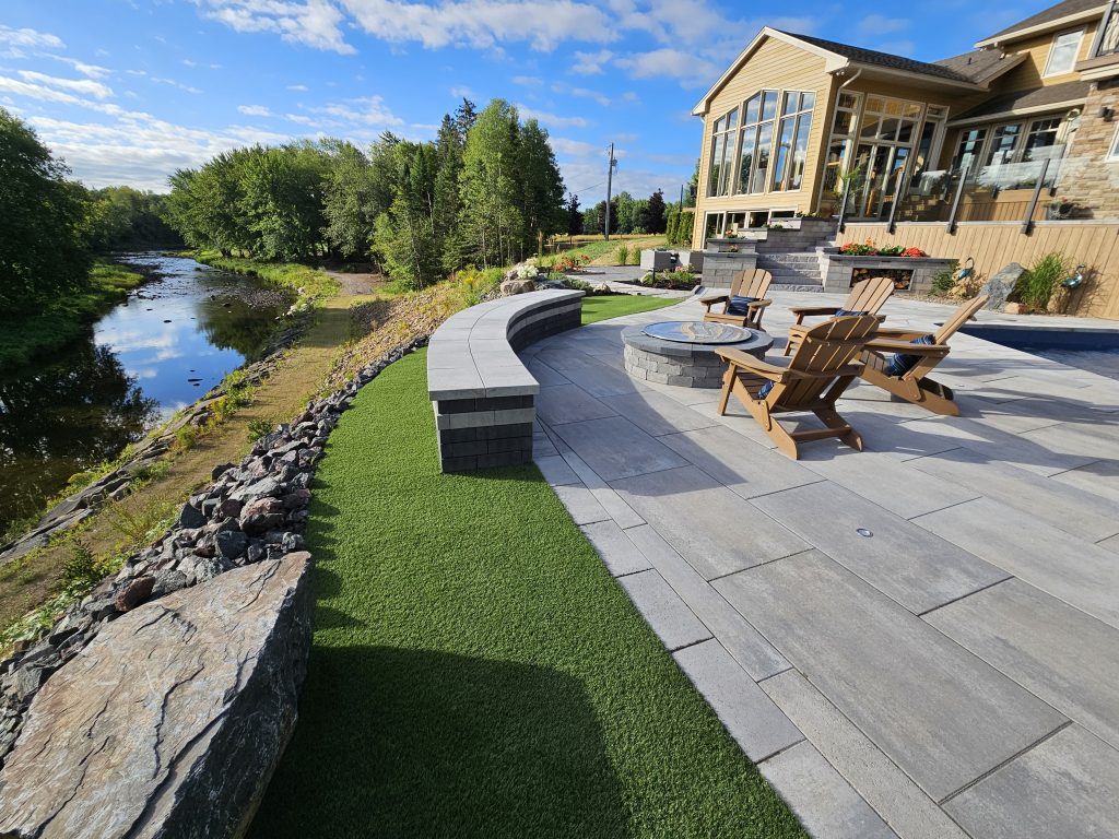 As the sun sets, the landscape lighting creates a warm atmosphere, and the cozy fire area overlooking the river becomes the ideal gathering spot. Every detail was carefully planned and crafted to bring the homeowners' vision to life, ensuring that this retreat is both functional and beautiful.